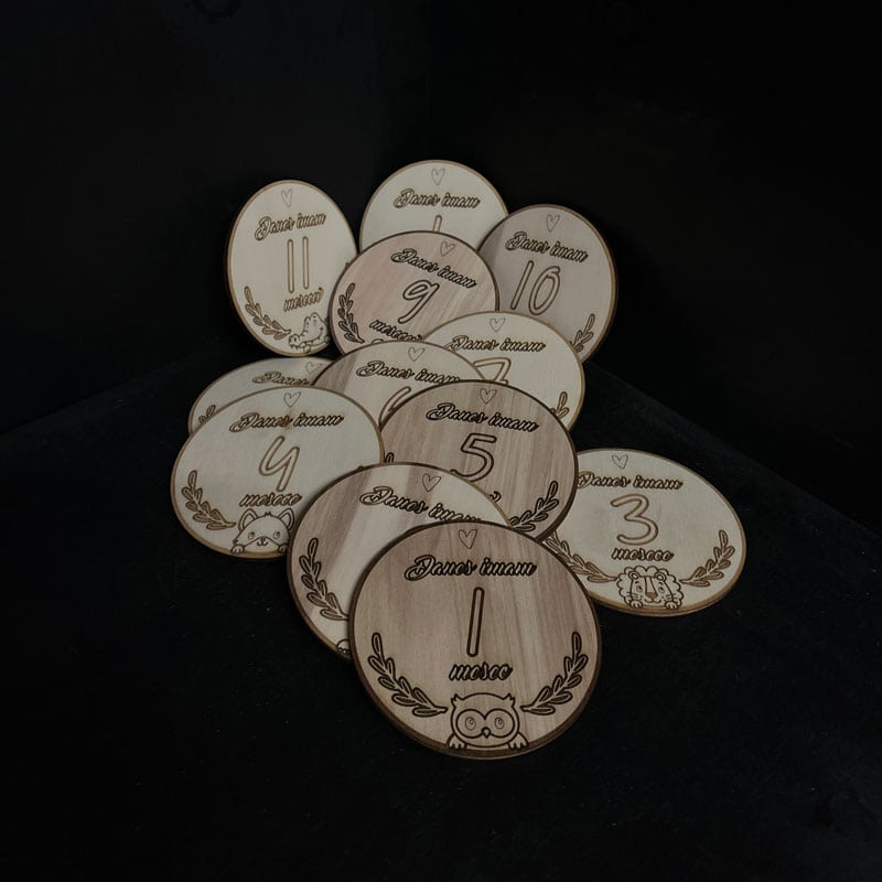Komplet unikatnih okroglih lesenih graviranih tablic, ki ponazarjajo starost vašega otroka ob fotografiranju. Lep spominek na lepe, sladke, srčkane in “slinaste” mesece.